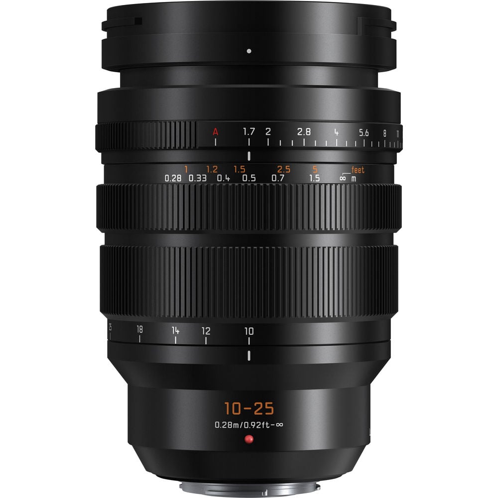 The Panasonic Leica DG Summilux 10-25mm f/1.7 ASPH is a unique, high-speed zoom lens offering a 20-50mm FF-equivalent range that includes wide-angle to standard focal lengths. It weighs approximately 690 grams and measures 87.6mm in diameter by 128mm in length.