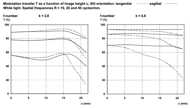 So good is the lens, its MTF (modular transfer function) chart shows there is little improvement to stopping down. Contrast is excellent both wide open and stopped down, with resolution improving and flattening out slightly by f/5.6. As you can see, there is some astigmatism as you move away from the center, likely due to residual spherical aberration. Keep in mind, Zeiss publishes measured MTF charts, not theoretical MTFs — something that no other manufacturer does.