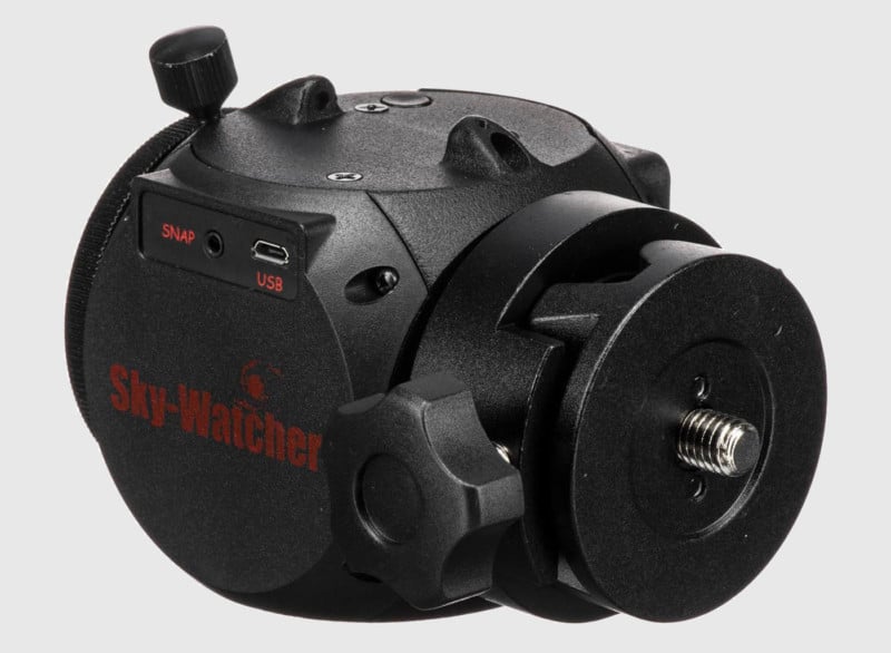 Like the iOptron Skyguider Pro, the Sky-Watcher Star Adventurer 2i is not to be confused with the smaller Sky Watcher Star Adventurer Mini. It has a much more capable 11 lbs load capacity and comes standard with an alt-az base, polar scope, and declination bracket with counterweight. It takes 4 AA batteries and can also be powered externally via mini USB.