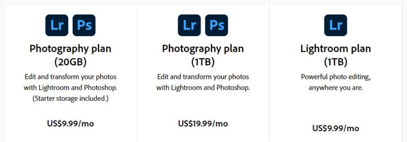 In addition to the basic photography plan, there are two other options available to photographers. First, you can upgrade to 1TB of cloud storage by paying $19.99 per month instead of $9.99. If you do not need Photoshop, you can get just Lightroom with 1TB storage for $9.99 per month.