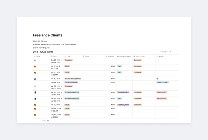 For example, I use Notion to keep track of photo shoots by creating an entry for every booking. This entry contains information such as a client’s details, shoot date and location, notes that I may have added throughout communication, links to their invoices, and more. Then, each shoot can be moved across the board to be placed under categories that I’ve created, such as “In progress,” “Need attention,” “Finished,” and so forth.