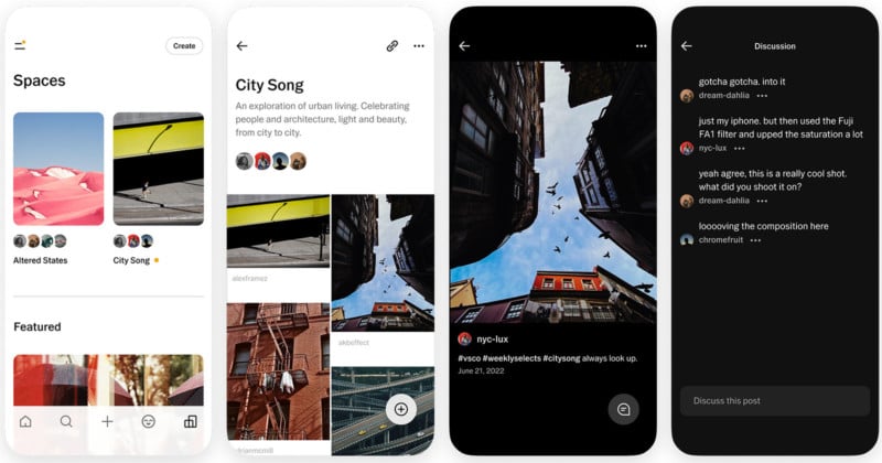 Last month, VSCO rolled out its social network-like community feature, Spaces. The company positions Spaces as a new way to connect with other photographers through visual conversations and shared galleries “around a particular theme, photography style, event, or location.”