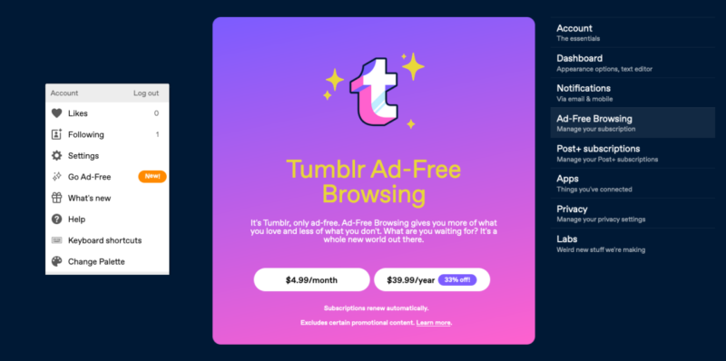 Tumblr is free to use. However, if you want to view blogs ad-free, you will either need to pay $4.99 per month for the monthly subscription, or $39.99 per year for the annual subscription.