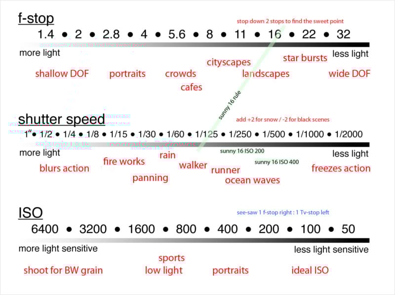 Here is a handy chart that shows full-stop intervals of aperture, ISO, and shutter speed: