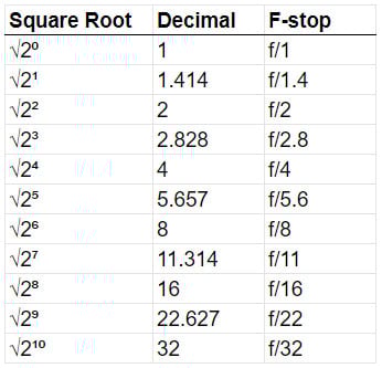 In reality, the progress of f-stops is a simple geometric sequence: the powers of the square root of two (or the square root of the powers of two). Here is the sequence laid out: