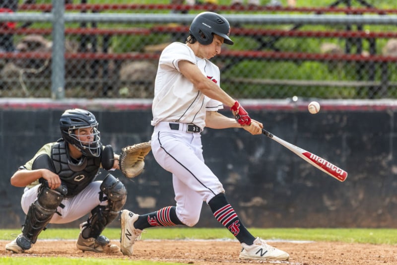One of the biggest considerations in sports photography is how you are going to freeze your subject and avoid motion blur. This is accomplished by using a very fast shutter speed, usually something like 1/500, 1/1000, or faster. In order to accomplish your goal, you probably need to set your aperture as wide as it will go (we call this shooting wide-open). This will give your exposure maximum light in terms of aperture, so then you can use faster shutter speeds. There is a danger in your shutter speed being too slow, but if you’re trying to freeze motion, you can’t really make it too fast. Keep in mind that shooting wide-open will give you a shallow depth of field, so your focus will need to be more accurate in order to get your subject in focus.