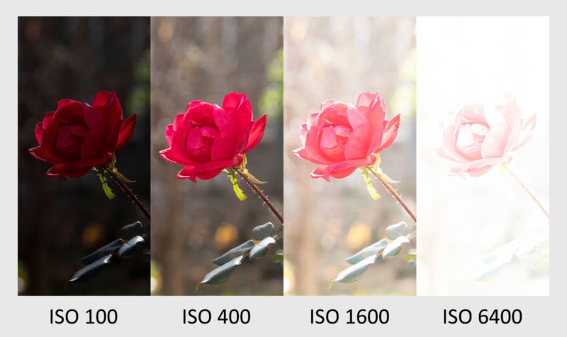 Put simply, with all else being equal, a higher ISO will produce a brighter image and a lower ISO will produce a darker image. Most ISO values follow a similar sequence to 100, 200, 400, 800, 1600, 3200, and 6400. ISO 100 will produce the darkest results, and ISO 6400 will produce the brightest results (assuming that shutter speed and aperture do not change).
