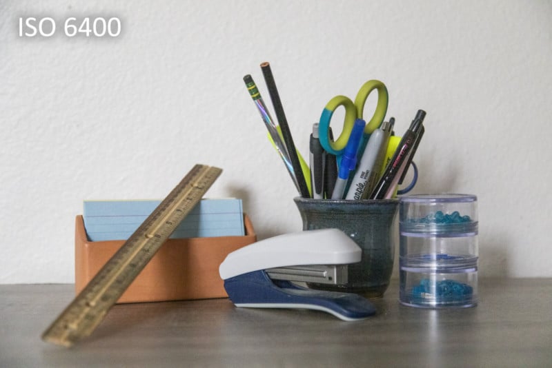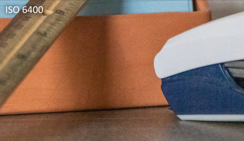 Here is a closer look at a cropped section of the scene at ISO 100, ISO 800, and ISO 6400.