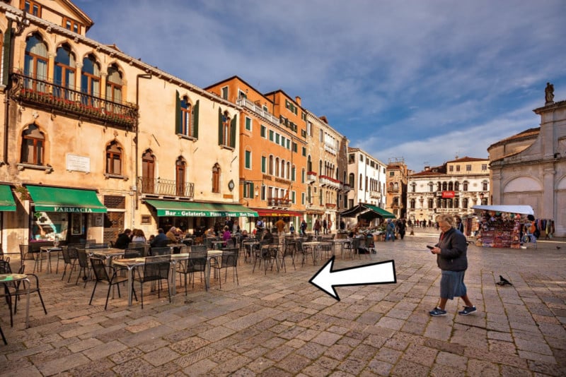 This photo was also taken on Saint Mark’s Square. This time, it completely ignores the “rule of odds” several times in the frame. There are two principal human subjects, four street lamps, and two ornate columns, all even numbers.