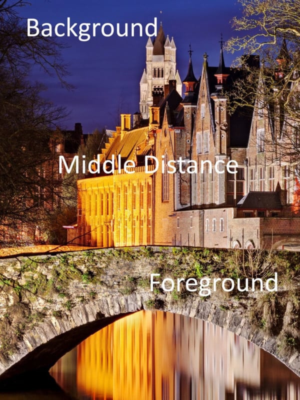 In this photograph of a canal in Bruges, the bridge acts as foreground interest. The buildings along the canal provide the next layer in the middle distance. These buildings then lead the viewer through the image towards the more distant elements. Finally, the bell tower from a distant church rises from behind the other buildings in the background. In this case, I did the opposite to the photos with foreground interest; I used a zoom lens to compress the perspective.
