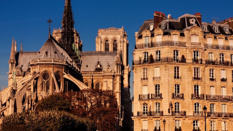 In this photo, Notre Dame Cathedral and the adjacent buildings almost completely fill the frame. This allows us to explore details such as the flying buttresses, the stonework, or the ornate balconies on the building next door. It is a scene where the eye wanders around the frame.