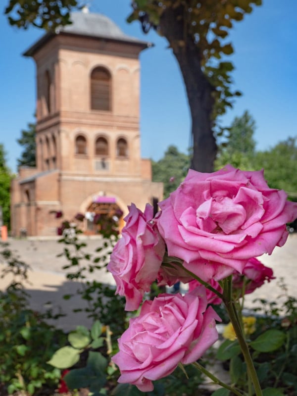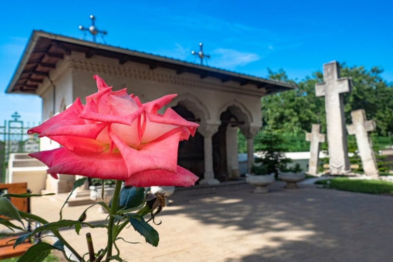 I took this photograph of a rose at a monastery complex on the outskirts of Bucharest, Romania. Once again I blurred the background just enough to let the rose stand out. There is still however enough detail to show the viewer the context that the rose was photographed in.