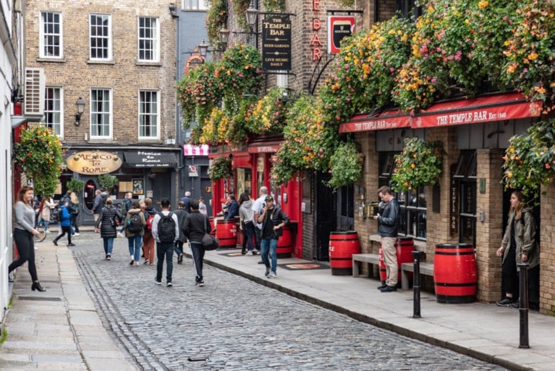 This photograph was taken in the Temple Bar area of Dublin City. The frame is full of different characters and activity. In this case, the eye can wander around the frame noticing all the little details such as the flowers, the building details, and various people walking, exiting a building, or checking their phone outside a pub. There is no one main subject.