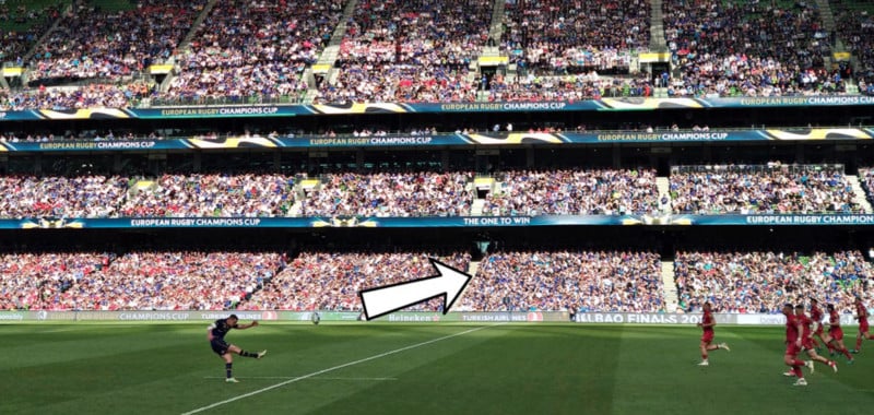 Admittedly, I’m not much of a sports photographer but I quite like this shot I snapped with my camera phone during a rugby match featuring the mighty Leinster. Notice how the kicker (Johnny Sexton) is placed to the left of the frame and the ball is traveling into the space on the right. He made the kick by the way.