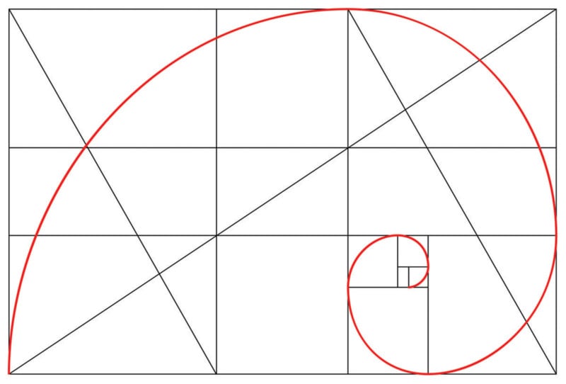 The similarities with the rule of thirds and golden triangles become clearer once we add a few lines to the diagram. The golden ratio also divides the frame into 9 parts although this time they are not all the same size and shape. The diagonals we saw in the golden triangles examples can also be added here.
