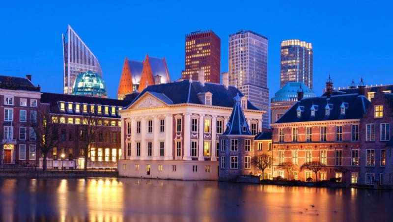 In this photograph, there is a juxtaposition between the beautiful older buildings of the Hague in the bottom half of the frame and the modern skyscrapers that rise up behind them. The handsome building in the center is the Mauritshuis Museum which houses paintings such as “The Girl with the Pearl Earring” and “The Anatomy Lesson of Dr. Nicolaes Tulp” by Rembrandt.