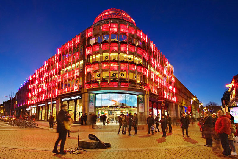 Red and blue are also complimentary colors on the color wheel. The Stephen’s Green Shopping Center in Dublin was lit up red for Christmas last year. This was very striking against the deep blue of the early night sky. I love photographing cities during blue hour. The deep blue of the sky at this time provides a very attractive backdrop to the city’s architecture and lights. The pure black of the late-night sky is not as striking and contrasts too sharply with the lights of the city.