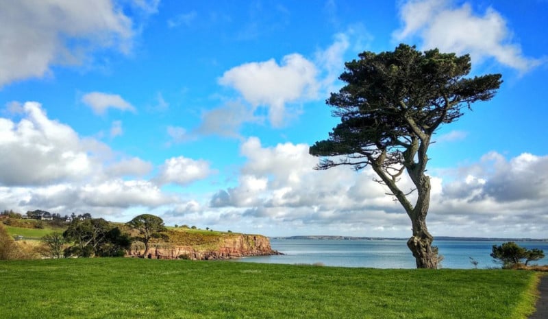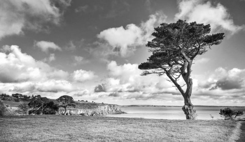 With the “distraction” of color removed, I think this becomes a much stronger shot. That harsh light now helps to highlight the textures on the tree, in the grass, on the cliffs, and in the sky. The bold shape of the tree stands out against the sky and the scattered clouds in the sky look more dramatic. The color was hiding much of this in my opinion. Not every shot is suited to a black and white conversion but in this case, I think it was.