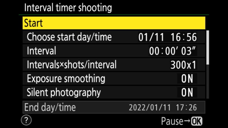 Another use case is for situations when the camera is set in the scene but the shooting will commence at a later given time and the operator will not be close to the camera, or if we just want to capture a self-portrait. We can program the intervalometer to have a delayed start that will save valuable frames, time, and battery life.