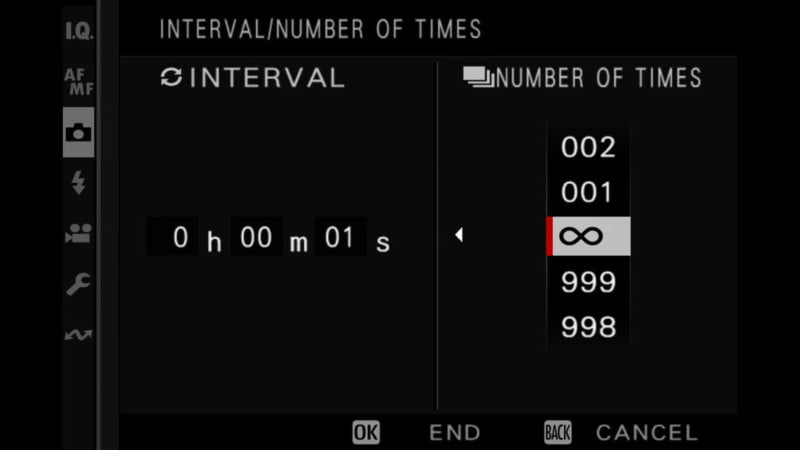 In the following images, we can see the intervalometer setting in Nikon and Fuji cameras.