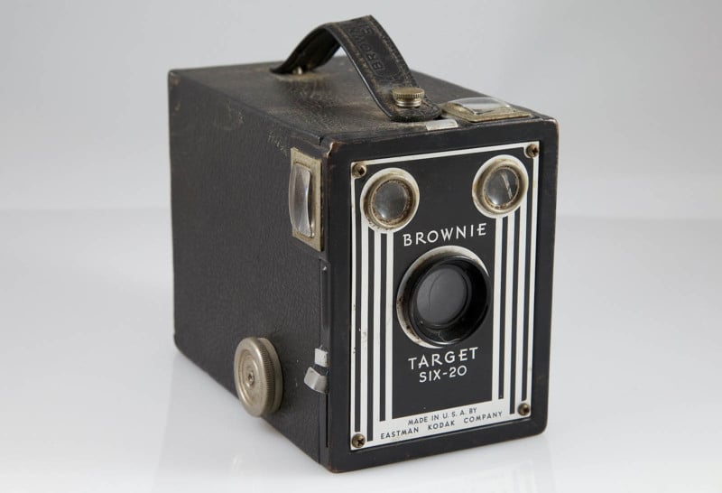 The box camera is just that – a simple box that was made of cardboard, wood, or plastic which had a lens and viewfinder installed. One of the most popular types of box cameras, one that’s still in use today, is the Kodak Brownie. This camera was made with a type of plastic called Bakelite. These cameras take 620 films, but with a quick tutorial you can find online and a 620 spool, you can easily wind your 120 films onto the 620 spools and you’re ready to go!