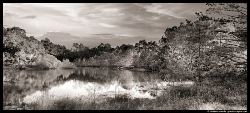 The zone values III, V, and VII are the deciding zones I concern myself with the most. Zone III is where the darkest tone with detail is. Zone V is middle grey (think Kodak’s 18% grey card). Zone VII is where the lightest tone with texture is. Zone II is almost black and Zone VIII is almost paper white. I treat zones outside of III through VII as accent tones and do not expect detail from them. For example, specular highlights should fall into Zones IX and X.