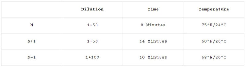 My standard kitchen sink developer is Rodinal. My normal mix for ASA 100 film is 1+50 (1 part Rodinal + 50 parts water), with water temperature at 68°F. The film develops nicely at 12 minutes. The examples below illustrate changes in temperature, time, and dilution for push/pull development with Rodinal.