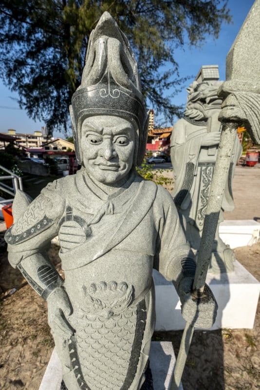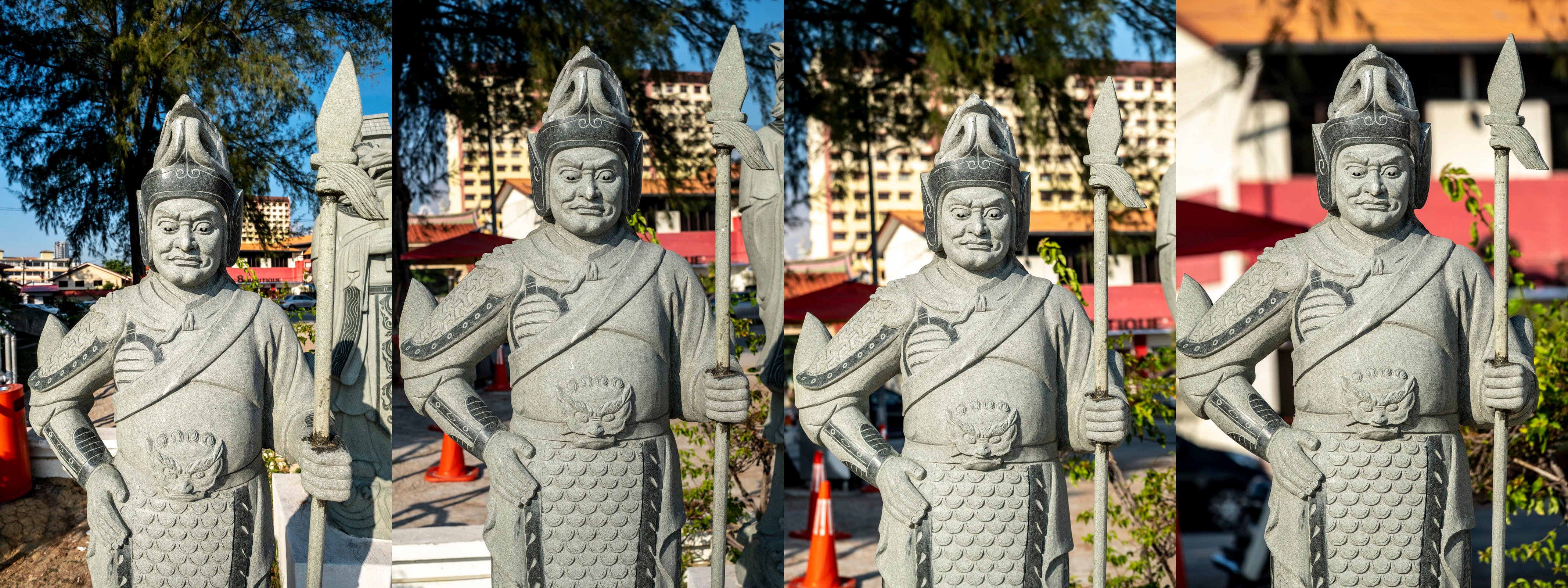 As for compression, we can clearly see background objects appearing closer when I readjusted my position to keep the subject (the warrior) framed in the relatively same position in the frame using the telephoto.