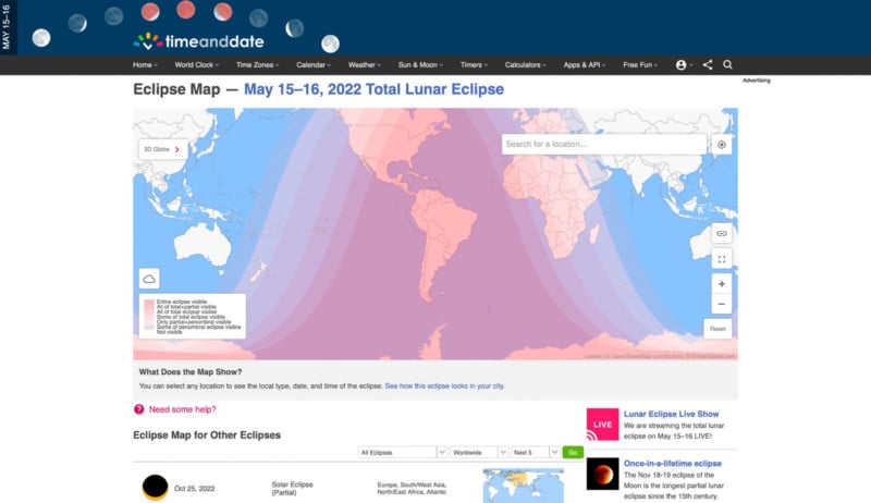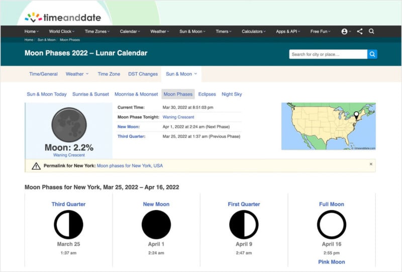 The next phase (hah) on this journey is figuring out the Moon Phase. Clear Outside and Astrospheric have this functionality built-in, but if you really want to plan ahead, check out timeanddate.com. Punch in your location and scroll to when you want to shoot.