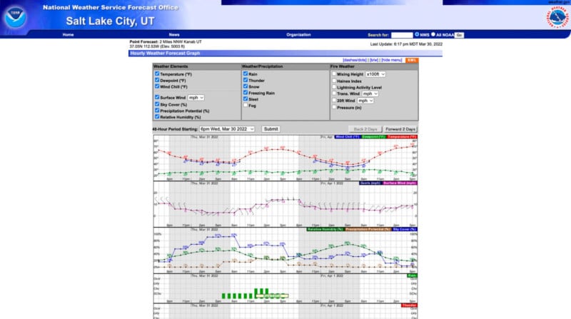 - National Weather Service/NOAA. Free forecasts for the US which also include archiving of previous forecasts for better trip planning and preparation for astrophotography destinations.