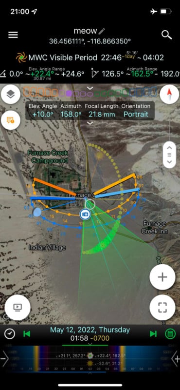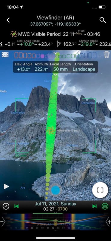 Additionally, use PhotoPills and Planit to figure this out. Each app has a planner mode that tells you this information. The disadvantage here is the smaller phone screen and lack of a full “planetarium style” view may make it difficult to determine when targets rise and set. PhotoPills has a specific function for the Milky Way core, Moon, and Meteor showers, while Planit also allows you to type in some popular nebula and galaxies as well.