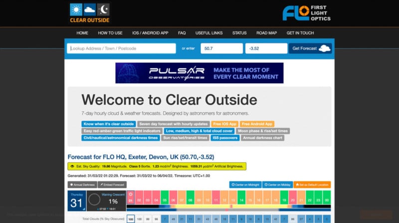 - Clearoutside.com. Free global forecasts with specific criteria for astrophotography.