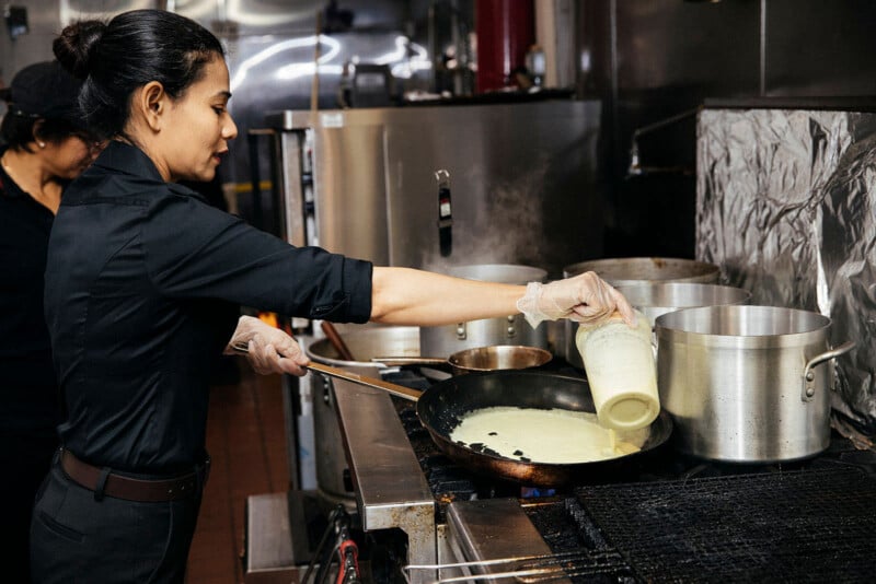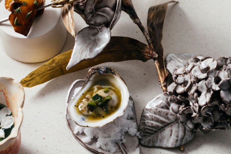 Moving from on-location photography to a studio setting gives you much greater control but also adds many production complications. For food photography, you’ll ideally need a studio space with a kitchen or, at the very least, some sort of ability to reheat or stage food. A studio shoot will also require a lot more creative direction versus taking advantage of whatever a restaurant space has. All plates, cutlery, and glassware need to be sourced. Someone will need to cook and stage each dish.