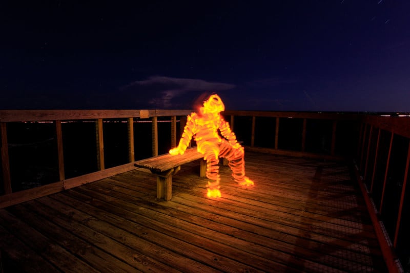One thing to keep in mind when creating an illuminated being is that it’s important to pick a position that will be easy for you to hold for the entire exposure. Listed below are the tools that I used, the camera settings, and the total exposure time.